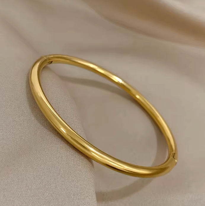 Bracciale aperto elegante e resistente da donna, realizzato in acciaio inossidabile lucido con placcatura in oro. Resistente all’acqua e perfetto come regalo elegante o gioiello da indossare ogni giorno.